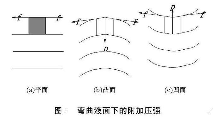 如果熔體表面是凸面,如圖3b所示,因表面張力沿周界與熔體面相切,則沿周界各個方向的表面張力f將產(chǎn)生一個指向熔體內(nèi)部的合力p(正壓力),使得熔體表面曲率變小。如果液面是凹面,如圖3c所示,表面張力的合力將指向熔體外部,對熔體則產(chǎn)生一個負壓力,使得凹面變平,甚至有可能轉(zhuǎn)化為凸面。由于表面張力的作用,熔體表面能夠截凸補凹,自動修復(fù),表面平滑,這正是陶瓷釉層表面能夠平整光滑的主要原因。