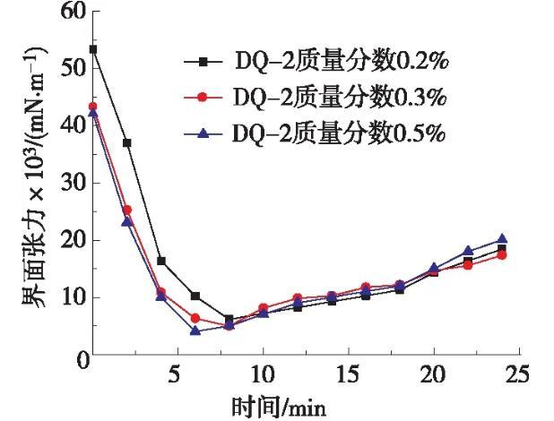將一定質量濃度的低界面張力表面活性劑DQ-2體系溶液與巖心按照質量比為1∶6的比例混合,在油藏溫度(80℃)條件下靜置5 d,每天分別測定低界面張力表面活性劑DQ-2體系與原油的油水界面張力。