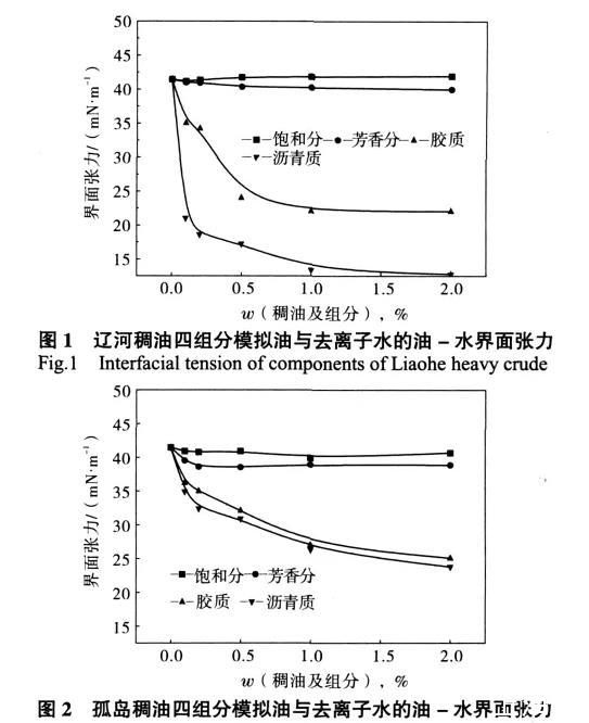 (1)遼河稠油組分中的芳香共軛成分以及含氧、氮的極性基團(tuán)均大于孤島稠油組分,其界面活性也強(qiáng)于孤島稠油的。