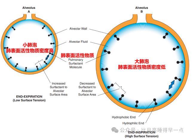 然而,機(jī)體并不會(huì)出現(xiàn)上述情況,這主要是由于小肺泡的肺表面活性物質(zhì)分布密度大于大肺泡,故在r小的同時(shí),T也小,因此大小肺泡的肺泡液-氣界面的壓強(qiáng)基本相同。見圖3。