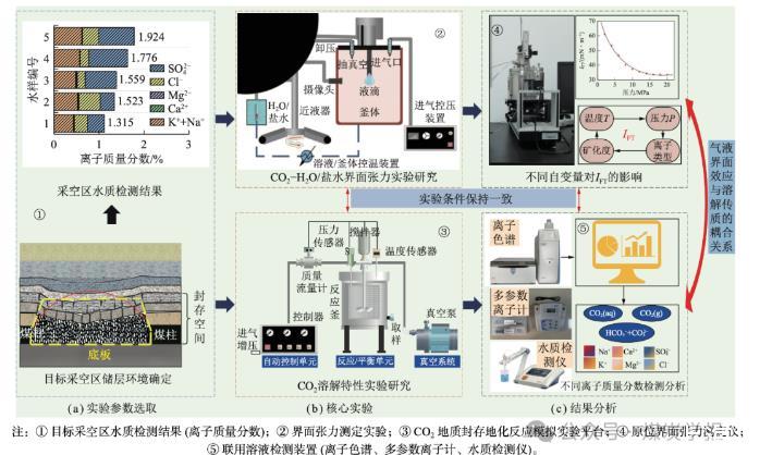采空區(qū)CO2封存作為解決煤炭行業(yè)碳排放難題的重要負(fù)碳技術(shù)儲備,在采空區(qū)廢棄資源二次利用、CO2封存等方面具有廣泛的應(yīng)用前景。利用原位界面張力測定儀開展了不同溫壓、地層水礦化度及陽離子溶液類型對CO2地層水系統(tǒng)的界面張力(IFT)影響規(guī)律實驗,明晰了CO2注入含水碎脹煤巖體中的氣液界面擴散效應(yīng),并將基于統(tǒng)計締合理論結(jié)合蘭納?瓊斯勢能模型的狀態(tài)方程(SAFT-LJ狀態(tài)方程)與密度梯度理論(DGT)結(jié)合預(yù)測了IFT理論值;利用自主研發(fā)的地質(zhì)封存地化反應(yīng)模擬實驗平臺對相同條件下的CO2溶解性進行了探究實驗,得到了采空區(qū)儲層環(huán)境下CO2溶解度變化特征,采用D-S模型計算了對應(yīng)CO2溶解度理論值。