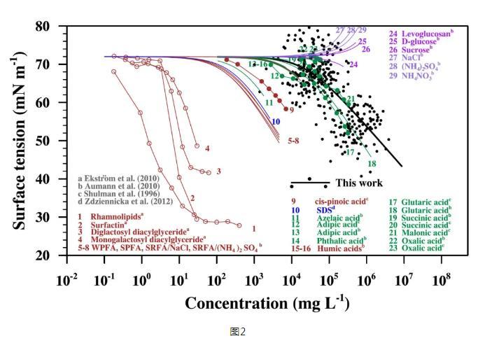 我們進一步比較了這次外場觀測中,城市氣溶膠所含有機物與各類已知化學(xué)成分的有機物造成的表面張力降低與有機物濃度的依賴關(guān)系,即Szyszkowski-Langmuir(S-L)曲線。結(jié)果表明,城市氣溶膠中隨表面活性有機物濃度增加導(dǎo)致表面張力降低的程度最接近二羧酸的依賴曲線。二羧酸在城市大氣氣溶膠中含量豐富,來源為人為源和生物源揮發(fā)性有機物的氧化降解,依此推測二羧酸在降低城市氣溶膠表面張力方面起著關(guān)鍵作用(圖2)。