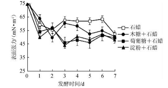 由圖1可知,以石蠟為碳源時,發(fā)酵液表面張力在發(fā)酵2 d時降55.45 mN/m,發(fā)酵2~3 d時上升至62.6 mN/m,發(fā)酵7 d時發(fā)酵液表面張力降至52.3 mN/m;以木糖+石蠟為培養(yǎng)基碳源時,發(fā)酵液在發(fā)酵2 d時表面張力快速下降,且整個發(fā)酵過程表面張力較低,在發(fā)酵7 d時發(fā)酵液表面張力降至50.45 mN/m;以葡萄糖+石蠟、淀粉+石蠟為碳源時,發(fā)酵液表面張力均在發(fā)酵3 d時降至最低,分別為45.9 mN/m、43.8 mN/m,發(fā)酵7 d時,表面張力分別降至49.5 mN/m、47.9 mN/m。因此,淀粉+石蠟為碳源時最利于發(fā)酵液表面張力的降低,效果最好。