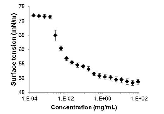 圖 2 牛氣水界面表面張力(±標準差) 精漿溶液中所含蛋白質(zhì)濃度的函數(shù) 提取并以對數(shù)刻度表示 (T = 23.2 ?C ± 0.3 ?C, n = 2, 4 次重復 每個樣品)。