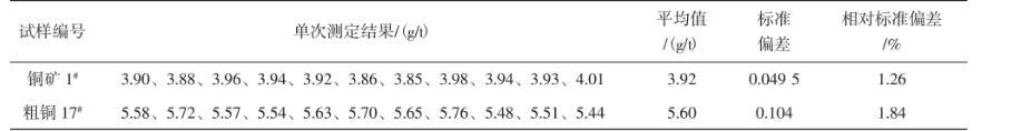 稱取20.00 g樣品,銅礦、銅渣樣直接干法試金配料,按試驗方法進行分析,結(jié)果見表4和表5。