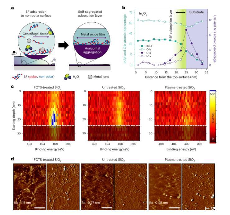 圖3a顯示了絲蛋白(SF)在不同表面能的基底上的吸附機(jī)制,假設(shè)疏水結(jié)構(gòu)域與非極性表面相互作用,而親水結(jié)構(gòu)域則面向溶液。作者通過X射線光電子能譜(XPS)和原子力顯微鏡(AFM)分析了摻有不同濃度SF的溶液在不同表面上的表現(xiàn)。XPS結(jié)果顯示,在非極性基底上,高濃度SF溶液形成了含有蛋白質(zhì)的薄膜,并且在高能離子轟擊下薄膜和基底界面上仍保留有N1s信號(圖3b,c)。AFM分析則揭示了不同基底上的表面拓?fù)浣Y(jié)構(gòu),非極性基底上呈現(xiàn)平躺形狀,而極性基底上則顯示島狀聚集體(圖3d)。研究表明,SF的吸附效率受表面能和分子量影響,并可有效增強(qiáng)潤濕性。這一適應(yīng)性吸附機(jī)制有助于在不同表面上快速形成高質(zhì)量金屬氧化物薄膜,無需調(diào)整沉積參數(shù)。