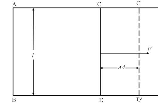 研究液體表面張力隨液體濃度、溫度、壓強(qiáng)等的變化規(guī)律的論著很多,卻很少有人研究液體表面張力隨液面拉伸程度的變化規(guī)律,從而隱喻了一種結(jié)論,即液體在濃度、溫度、壓強(qiáng)等條件不變時(shí),其表面張力的大小不會(huì)隨其表面被拉伸的程度而改變。多部專著都有這樣的經(jīng)典的論述,圖1所示的矩形金屬絲框覆有液膜,其中CD為活動(dòng)邊,長(zhǎng)為l,欲使體系平衡,必須施以適當(dāng)?shù)牧于CD邊上。CD邊在力F作用下克服液膜表面張力的阻礙而移動(dòng)距離Δd,對(duì)體系做功ΔA=F×Δd,F(xiàn)=2γ×l,γ=F/2l為CD邊的液體表面張力系數(shù)。在此論述中,先驗(yàn)地將液體表面張力視為不隨液膜面積變化而改變的恒量。