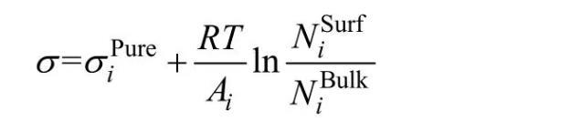 式中:σipure表示純組元和Al2O3)的表面張力;Ai為純組元i的摩爾表面積,其中L為校正因子,熔渣中設(shè)為1.091;N0為阿伏加德羅常數(shù),Vi為組元i的摩爾體積);R和T分別表示摩爾氣體常數(shù)和絕對溫度;為組元i在表面相或體相的質(zhì)量作用濃度。