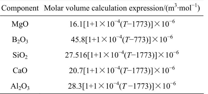 表1 MgO-B2O3-SiO2-CaO-Al2O3渣系中復(fù)雜分子的化學(xué)反應(yīng)及標(biāo)準(zhǔn)Gibbs自由能和作用濃度的表達(dá)式