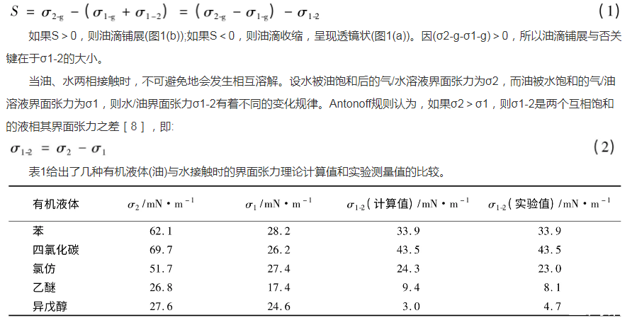 綜上可知,σ1-2不僅與兩相的界面張力有關(guān),還受兩相溶解性大小以及分子極性等的影響。對于油酸/水體系,由于(σ2-g-σ1-g)-σ1-2<0,故油酸在水表面呈透鏡狀懸浮,不發(fā)生鋪展。