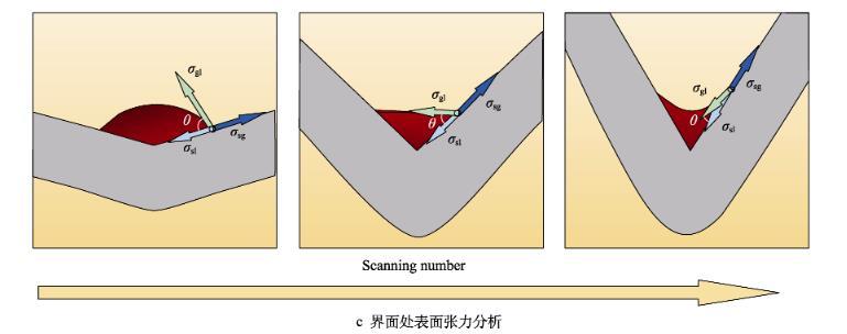 另一方面,材料內部的溫度梯度和界面表面張力亦會導致彎折區(qū)的形貌發(fā)生改變。通過觀測不同比能和掃描次數(shù)下薄板彎折區(qū)的成形狀態(tài)發(fā)現(xiàn),在高比能、多次掃描下,彎折區(qū)界面的形貌由凸向凹演變,潤濕角顯著降低,如圖1c所示??梢?,比能和掃描次數(shù)是造成形貌發(fā)生變化的重要因素,最終通過影響熔池的表面張力和溫度梯度,進而影響彎折區(qū)的宏觀形貌。