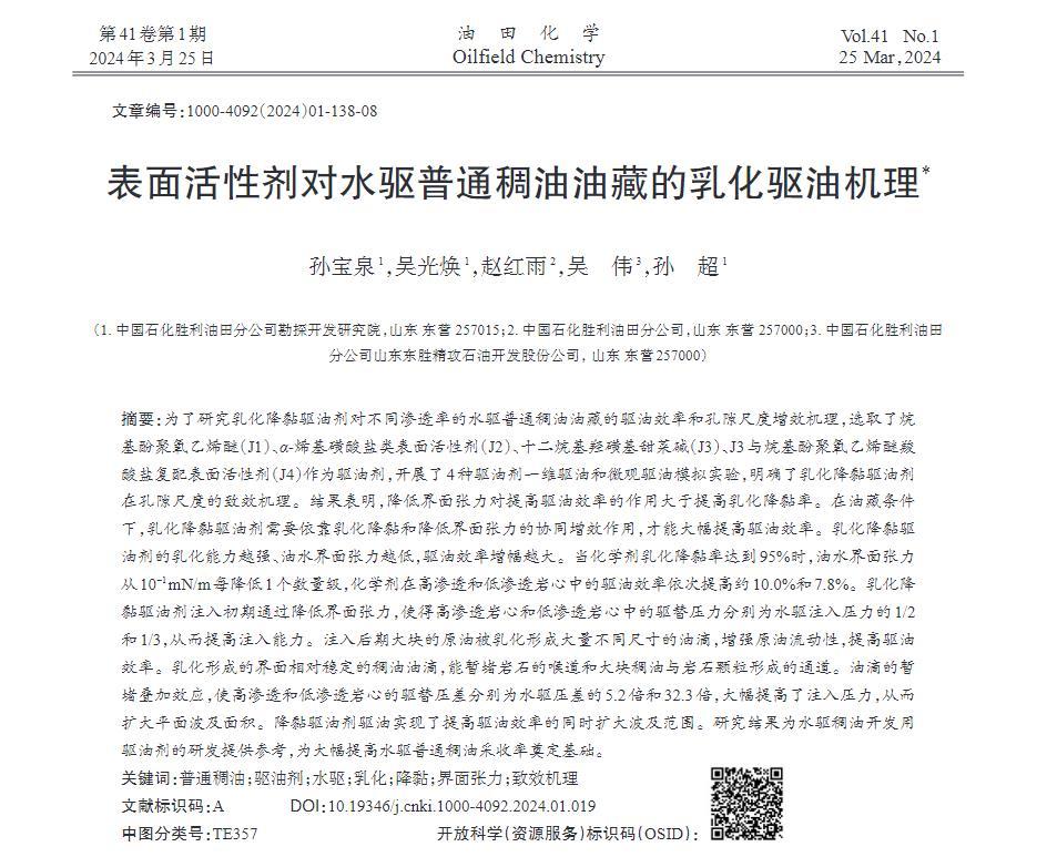 摘要:為了研究乳化降黏驅(qū)油劑對不同滲透率的水驅(qū)普通稠油油藏的驅(qū)油效率和孔隙尺度增效機(jī)理,選取了烷基酚聚氧乙烯醚(J1)、α-烯基磺酸鹽類表面活性劑(J2)、十二烷基羥磺基甜菜堿(J3)、J3與烷基酚聚氧乙烯醚羧酸鹽復(fù)配表面活性劑(J4)作為驅(qū)油劑,開展了4種驅(qū)油劑一維驅(qū)油和微觀驅(qū)油模擬實驗,明確了乳化降黏驅(qū)油劑在孔隙尺度的致效機(jī)理。