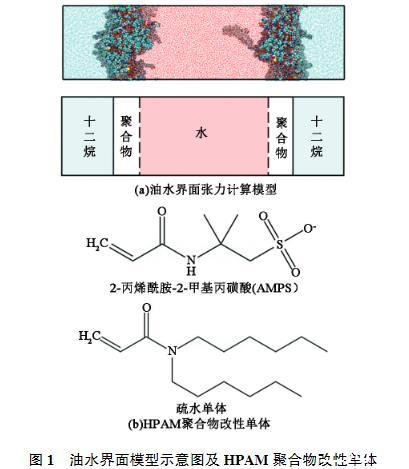 為研究聚合物對油水界面張力的影響,模擬體系由油相、水相、聚合物分子3部分組成,模型見圖1(a)。其中油相由正十二烷分子來模擬,聚合物選擇HPAM以及改性后的聚丙烯酰胺進行對比研究。