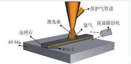 前期開展了激光釬涂金剛石技術(shù)研究,分析了激光功率和掃描速率對涂層微觀組織與力學性能的影響。從現(xiàn)有研究來看,已有的激光釬涂金剛石研究大多數(shù)集中于金剛石/釬料合金界面的組織演變和單層金剛石工具的機械加工性能方面,在釬涂層的成形過程方面尚未進行深入的研究工作。前期研究發(fā)現(xiàn),在激光釬涂金剛石過程中,金剛石易于向表面聚集,這對涂層的整體性能提升將會產(chǎn)生極大的影響,因此需要針對涂層的成形行為及其機理方面進行深入的研究,進一步提升涂層的耐磨性能。文中采用BNi-2合金作為釬料,利用光纖激光在65Mn鋼基體上制備金剛石涂層,并利用高速攝影技術(shù)觀察金剛石激光釬涂過程中,鎳基粉末形成涂層和金剛石遷移全過程,分析釬涂層的成形行為及其機理,并討論激光釬涂金剛石的能量轉(zhuǎn)換與傳遞路徑,以期為激光釬涂金剛石的工程應(yīng)用提供數(shù)據(jù)支撐。