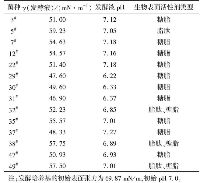 經(jīng)富集分離共得到49株細菌,初步篩選出14株生長較好的目的菌株接種于發(fā)酵培養(yǎng)基。在微生物采油過程中,表面活性劑和有機酸可以把原油從巖層中剝離下來,提高原油流動性。因此,以發(fā)酵過程中發(fā)酵液的pH和表面張力的降低為指標,對初篩得到的菌株進行復篩,同時分析所產(chǎn)生物表面活性劑的類型,結(jié)果見表1。