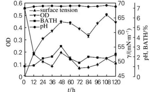 生物表面活性劑產(chǎn)生菌菌體密度、細胞疏水性與發(fā)酵液pH及表面張力的關(guān)系(二)