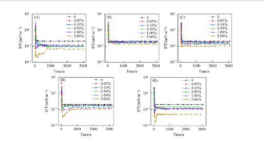 此外,活性分子稀疏地排列在界面上,如圖6(B)所示,并形成稀薄的混合吸附膜。因此,隨著時(shí)間的推移,吸附速率和脫附速率達(dá)到平衡,IFTs曲線也呈“L”形。在高濃度時(shí),瀝青質(zhì)組分獲得了較高的能量,能夠突破油水界面能壘,因此這些組分能夠更快地?cái)U(kuò)散到界面,并與P-S14-4分子無序地排列在界面上。當(dāng)這些亞組分與P-S14-4分子之間形成了最緊密的混合吸附膜時(shí),明顯的協(xié)同作用產(chǎn)生,導(dǎo)致IFT達(dá)到最小值。