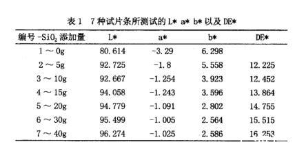 由表1可以看出,選擇沒用添加二氧化鈦的高溫尼龍HTN即1~0g做為標(biāo)準(zhǔn)樣,并測試其L*,a*,b*數(shù)值,2~5g,3~10g,4~15g,5~20g,6~30g,7~40g做為比較樣。從數(shù)據(jù)上進行比較,隨著添加量的增加,2號~7號色差DE*逐漸增加,即試樣表現(xiàn)得越來越白,2號~3號添加量增加5g,雖然L*值變化不明顯,但是b*值變化還是蠻大的,此比例不能說明添加量已經(jīng)達(dá)到飽和狀態(tài)。4號~5號添加量增加5g,L*數(shù)值變化0.7,5號~6號隨著添加量繼續(xù)增加10g,L*數(shù)值只變化0.7,說明隨著二氧化鈦添加量的增加,體系所表現(xiàn)的顏色趨于飽和。