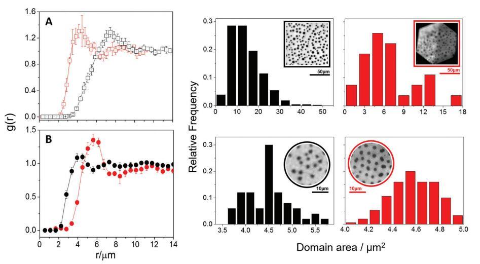 圖 3 中性 (A) 和帶電 (B) 域的徑向分布函數(shù)及其各自的域區(qū)域分布。 雙層顯示為紅色 和黑色的單層。 (A) 中的 %Lo 對應(yīng)于 20–23%,而 (B) 中的 %Lo 對應(yīng)于單層和雙層的 16–19%。 插圖:代表性熒光 脂質(zhì)膜的圖像。