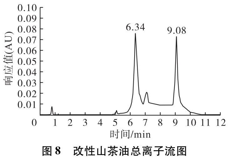 因為AccucoreTMC18色譜柱為非極性毛細(xì)管柱,非極性柱的保留作用主要是色散力造成的,其出峰順序一般符合沸點規(guī)律,沸點低的先出峰,沸點高的后出峰,所以PEG600單酯先出峰,PEG600雙酯后出峰。通過譜庫檢索發(fā)現(xiàn),6.34 min的峰主要是PEG600單酯,而9.08 min的峰主要是PEG600雙酯,這也說明PEG600和山茶油的水解產(chǎn)物發(fā)生了酯化反應(yīng)且改性山茶油的主要成分是PEG600單、雙酯。
