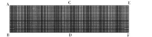 采用聚合物專用流體分析軟件Polyflow,對圓形截面的流道進(jìn)行模擬分析,探討表面張力的尺寸效應(yīng)及表面張力系數(shù)和接觸角對微擠出流場的影響。由于流道結(jié)構(gòu)及流場的對稱性,本模擬采用軸對稱分析。模擬分析的流道尺寸及網(wǎng)格劃分如圖2所示。微通道尺寸AE=4×AB=1.2mm。網(wǎng)格采用四邊形結(jié)構(gòu)單元。節(jié)點數(shù)量為3751,網(wǎng)格數(shù)量為3600。