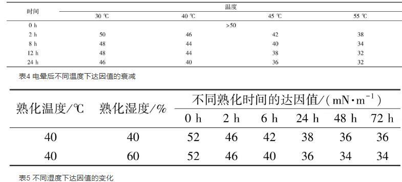 隨著保存時(shí)間的增長,背板的達(dá)因值也隨著逐漸降低。在低溫30℃下保存1d后達(dá)因值仍能達(dá)到48 mN/m,濕度越低,達(dá)因值下降越緩慢。溫度越高濕度越大,達(dá)因值下降越快。