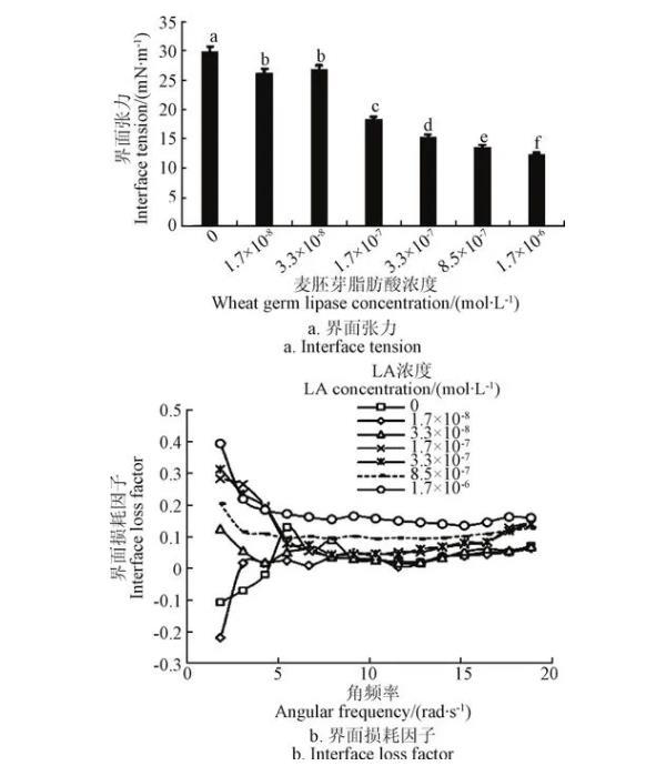 三油酸甘油酯濃度對油水界面特性的影響見圖6。由圖6可見,當(dāng)麥胚LA濃度為1.70×10-6mol/L時,油水界面張力隨癸烷中三油酸甘油酯濃度的增加呈現(xiàn)先增加后減小的變化規(guī)律;當(dāng)三油酸甘油酯濃度介于10-5~10-3mol/L時,相同角頻率時界面損耗因子隨著濃度增加無明顯變化規(guī)律。此外,在試驗過程中,界面張力隨時間延長呈現(xiàn)一定下降趨勢,這說明麥胚LA與三油酸甘油酯的水解過程也會對界面張力產(chǎn)生一定影響。原因在于,在界面體系中,三油酸甘油酯可被麥胚LA水解,產(chǎn)生小分子的油酸等,三油酸甘油酯與麥胚LA組成的界面發(fā)生變化,進(jìn)而影響界面特性。