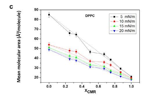 純和混合單層的 pA 等溫線與分子面積的關(guān)系如圖 1 所示。CMR/DPPG 等溫線顯示出與純 DPPG 脂質(zhì)相似的趨勢(圖 1a)。 相似相 對所有 CMR/DPPG 混合物都觀察到了轉(zhuǎn)變。 DPPG 和 DPPC 顯示崩潰壓力 (DPcoll) 為 52 mN.m-1 次方和 60 mN.m-1次方 , 分別。 一個過渡 (p ffi 3 mN.m-1次方 ) 從液體 發(fā)現(xiàn)純 DPPE 單層膨脹為凝聚相 與 D. coll 在 ffi55 mN.m-1次方 . 為 D. coll 獲得的值 純脂質(zhì)與文獻一致(Vollhardt 等人, 2000; 諾沃塔斯卡等人,2014 年)。