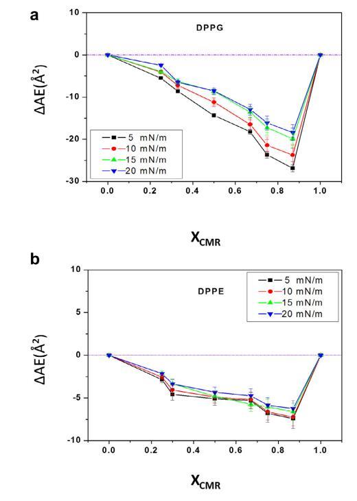 分子面積作為 CMR/ DPPG如圖5a所示。 可以看出負(fù)偏差 mma (XCMR = 0.33–0.67) 由于分子吸引力相互作用的增加。 CMR/DPPG 薄膜被認(rèn)為是部分混溶和非理想的浮動單層,因為線性度不高 觀察到的。 CMR/DPPE 混合薄膜的結(jié)果在 XCMR=0.25 和 0.67 時表現(xiàn)出不同的斷裂點(圖 5b)。 DAE 節(jié)目 包裝效率甚至幾何形狀的改進 調(diào)節(jié)發(fā)生在較低的 XCMR(圖 6)(Andrade 等人, 2006; 周和張,2000)。