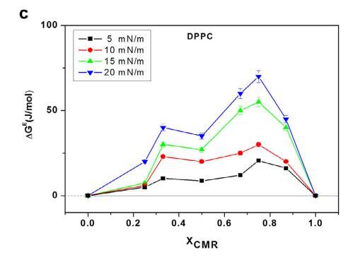 CMR/DPPG 混合膜的 ?Ge 和 ?Gmix 表示負(fù) 從 XCMR ≥ 0.25 到 XCMR = 1.0 的偏差(圖 7a 和 8a)。 ?Ge 和 ?Gmix 負(fù)值表明 CMR/DPPE 單層是 熱力學(xué)穩(wěn)定(圖 7b)。 ?Ge 和 ?Gmix 值為 DPPC 混合單層陽性,表明不混溶 (圖 7c 和 8c)。 分子之間的距離取決于 在導(dǎo)致排斥的磷脂頭部基團上 互動(邁爾斯,1999 年;博格斯,1987 年)。