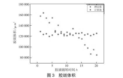 在液橋斷裂后,轉(zhuǎn)移到點膠面上的膠液在自身表面張力的作用下形成圓潤的膠斑,在理想狀態(tài)下膠斑可視為球冠狀,其體積可用球冠狀公式求得。實驗主要使用的膠液為甲基硅油,其表面張力只有21 mN/m,低于環(huán)氧樹脂,在基板上由甲基硅油形成的膠斑在穩(wěn)定狀態(tài)下與環(huán)氧樹脂的形狀不同,因此不能將其視為球冠狀,需要其他計算體積的方法。為了提高計算的準(zhǔn)確性通過灰度處理、二值化等圖像處理的方法提取膠斑的輪廓信息,之后通過提取到的坐標(biāo)信息來擬合膠斑輪廓的函數(shù),使用旋轉(zhuǎn)積分的方法來計算膠斑的體積。之后為了驗證計算的準(zhǔn)確性,在其他物性條件相同時,將5 000 cps的甲基硅油、3 mm/s的移液針抬升速度的實驗條件下膠斑的鋪展過程作為研究對象。用顯微鏡錄制在液橋斷裂后膠斑的鋪展情況,以0.016 s為間隔,截取20張膠斑的圖片分別用公式和積分法進(jìn)行膠斑體積的計算,結(jié)果如圖3所示。