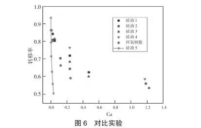 對不同黏度以及拉伸速度下的膠液進(jìn)行測量并計算轉(zhuǎn)移率,如圖4所示,在忽略慣性力的條件下,采用無量綱數(shù)Ca來表示轉(zhuǎn)移率,對于表面張力相似且不同黏度的四種甲基硅油的轉(zhuǎn)移率有著相似的收斂情況。為了進(jìn)一步印證Ca對轉(zhuǎn)換率的影響,引入與甲基硅油不同表面張力的環(huán)氧樹脂進(jìn)行對比實驗,如圖5所示,表面張力較大的環(huán)氧樹脂的轉(zhuǎn)換率會比甲基硅油小,但整體趨勢相差不大,均會收斂到一定數(shù)值。之后,為了了解慣性力對轉(zhuǎn)移率的影響,選擇黏度較小的膠液進(jìn)行實驗,同時加大移液針直徑使其脫離微量點膠的范圍,以提高慣性力對膠液傳遞的影響,如圖6所示,在通過增加膠液體積以提高慣性力影響的實驗中,膠液轉(zhuǎn)移率的變化與之前有極大差異。