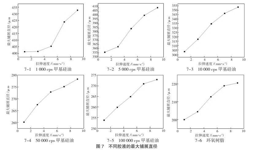 點膠結(jié)果最直觀的顯示就是形成膠斑達(dá)到穩(wěn)定狀態(tài)時膠斑的直徑,因此對膠斑的直徑進(jìn)行研究。選取5種表面張力相似黏度不同的甲基硅油以及黏度為10 000 cps的環(huán)氧樹脂作為實驗用膠。移液針抬升速度分別設(shè)置為1 mm/s,3 mm/s,5 mm/s,7 mm/s,9 mm/s。使用的移液針直徑為200μm。實驗結(jié)果如圖7所示。