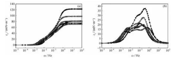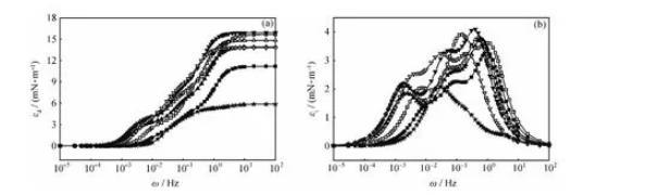 當頻率較低時,界面張力梯度在實驗時間內(nèi)幾乎可以完全消除,由于界面形變所造成的能量變化幾乎完全耗散在環(huán)境中,對擴張模量的貢獻可以忽略,εi接近于零;當頻率較高時,各種弛豫過程來不及發(fā)生,對擴張模量的影響也可以忽略,εi仍然接近于零;只有在適宜的頻率范圍內(nèi),εi隨頻率變化而變化,并在其弛豫過程的特征頻率處出現(xiàn)極大值。