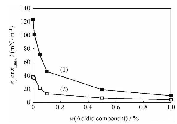 圖4 1.0%酸性組分對HMPAM水溶液-煤油體系極限擴張彈性(ε0)和擴張黏性最大峰值(εi,max)的影響