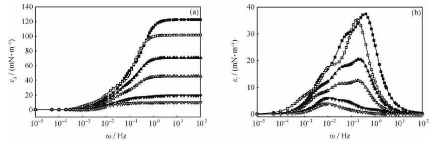 圖5含不同量酸性組分的煤油-1750mg/L HMPAM水溶液體系的界面擴張彈性(εd)和擴張黏性(εi)全頻率譜