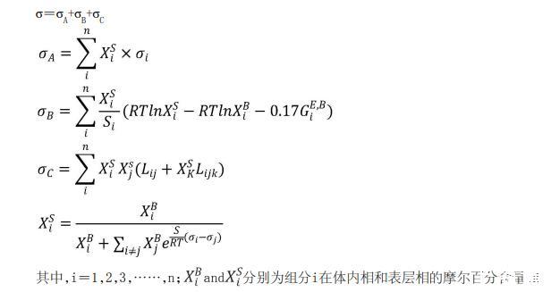其中,i=1,2,3,……,n;and分別為組分i在體內(nèi)相和表層相的摩爾百分含量;R摩爾氣體常量(8.314J/mol/K);T熱力學上的絕對溫度,K;Si純金屬i的表面積;σi純組分i的表面張力;σA為多元合金理想液相下的表面張力;σB為體相偏摩爾過剩吉布斯自由能對多元合金理想液相下的表面張力產(chǎn)生的偏析;σC為表相偏摩爾過剩吉布斯自由能對多元合金理想液相下的表面張力影響的修正項。