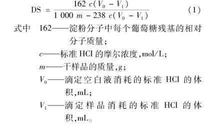 稱取干燥的棕櫚酸木薯淀粉酯1 g,置于250 mL的錐形瓶中,加入25 mL蒸餾水,滴加2滴1%酚酞指示劑,用0.1 mol/L NaOH溶液滴定至粉紅色,且顏色不消失。再加入25 mL濃度0.5 mol/L NaOH標(biāo)準(zhǔn)溶液,室溫磁力攪拌60 min。用0.5 mol/L HCl標(biāo)準(zhǔn)溶液滴定至溶液紅色剛好消失,記錄所用HCl溶液體積為V1。以木薯淀粉為空白實(shí)驗(yàn)。按式(1)計(jì)算取代度(DS):