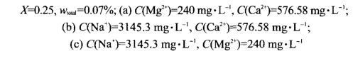 配制溶液所用的是高礦化度且含有高濃度二價金屬離子的模擬礦化水,從上面的實驗結(jié)果中看出,HDAPS/SDS混合體系在高鹽條件下可以與原油達(dá)到超低界面張力。考慮到在實際應(yīng)用過程中地層水的礦化度可能發(fā)生變化,恒定模擬水中Na+、Mg2+和Ca2+中兩種金屬離子的濃度,考察了Na+、Mg2+和Ca2+濃度變化對HDAPS/SDS混合體系與原油界面張力的影響,實驗結(jié)果如圖3所示。從圖中可以看出,模擬水中Na+濃度在1500-4500 mg·L-1、Mg2+濃度在120-360 mg·L-1和Ca2+濃度在200-800 mg·L-1范圍內(nèi)變化時,HDAPS/SDS混合體系與原油的界面張力均可達(dá)到超低界面張力,這說明在高礦化度和高濃度二價金屬離子條件下,HDAPS/SDS混合體系也表現(xiàn)出非常優(yōu)異的界面活性。
