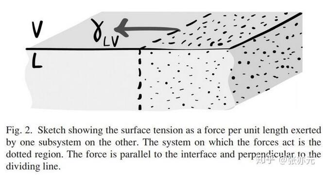 熱動(dòng)力學(xué)觀點(diǎn)和力學(xué)觀點(diǎn)可以用虛功原理聯(lián)系起來(lái)。圖1中的界面處的分子明顯受到一個(gè)垂直于界面方向的力,但圖2中的力明顯平行于界面,那么第1個(gè)關(guān)鍵問(wèn)題就是:為什么表面張力是一個(gè)平行于界面的力,即使它似乎一定垂直于界面?