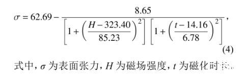 式中,z表示溶液表面張力,z0表示零點(diǎn)偏移量,x表示磁場(chǎng)強(qiáng)度,y表示磁化時(shí)長(zhǎng),A1~A5分別為x~x5的系數(shù),B1~B5分別為y~y5的系數(shù)。