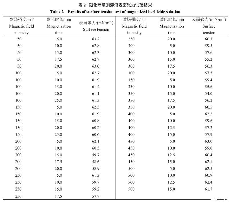 磁場(chǎng)強(qiáng)度和磁化時(shí)長(zhǎng)對(duì)除草劑溶液表面張力、噴霧霧滴粒徑的影響(二)