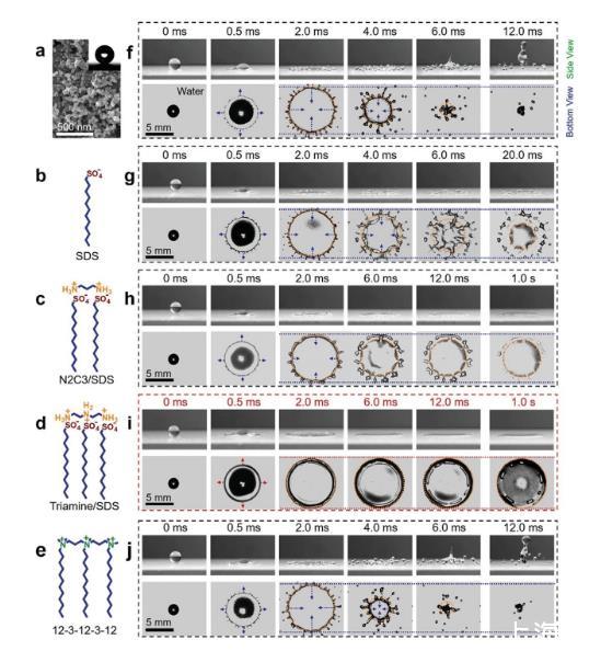 圖1.高速液滴撞擊超疏水表面的動態(tài)行為。a)掃描電子顯微鏡(SEM)揭示了表面的微觀結構。插圖:水接觸角為161.3±1.1°,確保超疏水性。b–e)表面活性劑的分子結構。f)撞擊超疏水表面的水滴出現飛濺和反彈。g–j)分別含有SDS、N2C3/SDS、三胺/SDS和12-3-12-3-12添加劑的水滴在超疏水表面上的撞擊動力學的側面和仰視圖。g,h)含有SDS或N2C3/SDS添加劑的液滴抑制了反彈,但仍會產生飛濺或后退破碎。i)含有三胺/SDS的液滴一旦與基材接觸就會形成穩(wěn)定的周邊邊緣,隨后完全沉積在超疏水表面上而不會發(fā)生任何飛濺或碎裂。完全均勻的潤濕膜在達到最大擴散面積后保持不變。j)合成低聚表面活性劑12-3-12-3-12添加劑對水滴的影響影響不大。濺射和反彈仍然會發(fā)生。箭頭的長度表示擴散或反彈速度的變化。