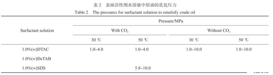 實(shí)驗(yàn)中觀察到原油的乳化情況與體系壓力及CO2存在與否的相關(guān)性,表2是CO2存在與CO2不存在條件下,1.0~10.0 MPa范圍內(nèi),表面活性劑水溶液中原油的乳化壓力。50℃時(shí),在DTAC水溶液/原油體系中,CO2不存在時(shí),水靜壓在1.0~10.0 MPa范圍內(nèi),始終存在原油的乳化現(xiàn)象。CO2存在時(shí),體系壓力低于4.0 MPa時(shí),存在原油的乳化現(xiàn)象,隨著CO2壓力升高,油水界面張力增大,原油乳化現(xiàn)象消失。說明在DTAC水溶液/原油體系中,CO2的存在不利于原油的乳化。50℃時(shí),在SDS水溶液/原油體系中,CO2不存在時(shí),水靜壓從1.0 MPa升高至10.0 MPa過程中,始終未出現(xiàn)原油的乳化現(xiàn)象。CO2存在時(shí),體系壓力升高到5.8 MPa以上,原油開始出現(xiàn)乳化、拉絲的現(xiàn)象。這說明CO2的存在有利于SDS水溶液乳化原油。其原因如下:一方面CO2的存在降低了SDS水溶液與原油的界面張力;另一方面,CO2通過水相擴(kuò)散進(jìn)入原油中,降低了原油的黏度,增強(qiáng)了原油的流動(dòng)性,同時(shí)CO2對(duì)原油中輕質(zhì)組分的萃取,也有助于原油中的輕質(zhì)組分?jǐn)U散進(jìn)入水相。因此高壓CO2增強(qiáng)了SDS水溶液對(duì)原油的乳化作用。在DeTAB水溶液/原油體系中,油水界面張力較大,無論CO2存在與否,始終沒有原油乳化現(xiàn)象的發(fā)生。