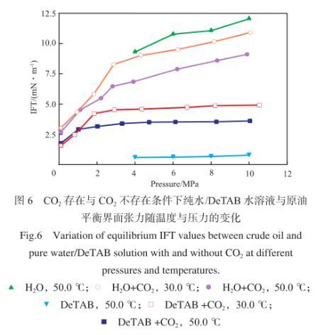 壓力低于2.5 MPa時(shí),飽和CO2的DeTAB水溶液與原油的界面張力隨著壓力的增加而明顯增大;壓力高于2.5 MPa時(shí),隨著壓力的增大,油水兩相界面張力雖增大,但變化不明顯。在其他表面活性劑水溶液/CO2/原油體系中,也存在類似的規(guī)律。說明CO2壓力較高時(shí),表面活性劑降低油水界面張力的作用占主導(dǎo),使得壓力升高導(dǎo)致的油水界面張力增大的作用不顯著。