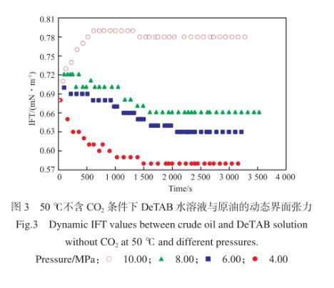 圖3為50℃、不含CO2條件下,DeTAB水溶液與原油的動(dòng)態(tài)界面張力。由圖3可知,在DeTAB水溶液/原油體系中,油水兩相界面張力在初始階段有較大的變化,在接近平衡界面張力時(shí),變化幅度趨于平緩,油水兩相界面張力穩(wěn)定所需時(shí)間在1 500 s左右。