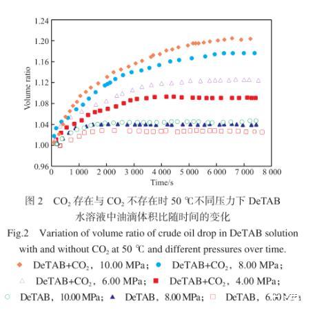 圖2為50℃下,CO2存在與CO2不存在時(shí),DeTAB水溶液/原油體系中,油滴的體積與初始體積比隨時(shí)間的變化。由圖2可知,對(duì)于原油/CO2/DeTAB水溶液體系,在初始階段,油滴體積增加較快,在油滴體積增加到平衡值附近后,體積增加變緩慢。油滴體積達(dá)到穩(wěn)定所需時(shí)間在3 500~6 500 s范圍內(nèi)。同時(shí),隨著壓力的升高,油滴的平衡體積與初始體積比逐漸增大,這與原油體積膨脹系數(shù)隨著CO2壓力增大而增大相吻合。不含CO2的DeTAB水溶液/原油體系中,油滴體積達(dá)到平衡值所需時(shí)間在1 300 s左右,遠(yuǎn)小于CO2存在時(shí)達(dá)到平衡狀態(tài)所需的時(shí)間;同時(shí),油滴體積的增加幅度明顯低于CO2存在時(shí)的情況。CO2存在時(shí),DeTAB水溶液/原油體系中,油滴體積的明顯增大,說明水中溶解的CO2可以有效地?cái)U(kuò)散進(jìn)入油相中,實(shí)現(xiàn)其對(duì)原油的溶脹效果,這將利于將油藏孔隙中的一部分殘余油排出,從而提高油田采收率。
