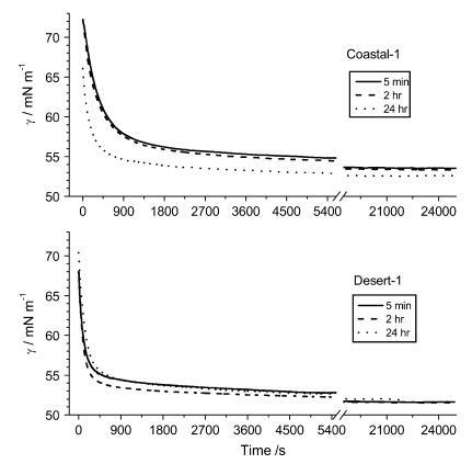 1:1 提取物的動(dòng)態(tài)表面張力測(cè)量 表明達(dá)到平衡的時(shí)間 γLV 從大約 15 分鐘到長達(dá) 5 小時(shí)不等(圖 1)。 在所有情況下,都有一個(gè)相對(duì)較快的初始速度 γLV 的變化,這可能是擴(kuò)散受限的,和 然后是一段長時(shí)間的低利率 γLV 的變化。 平衡達(dá)到率低的時(shí)期被假定為至少兩個(gè)過程的結(jié)果:(i)不同分子之間的表面競爭 吸附位點(diǎn); (ii) 表面分子的重排。 時(shí)間之間沒有明顯的關(guān)系 實(shí)現(xiàn)不同的平衡 γLV 和提取時(shí)間 土壤(圖 1)。