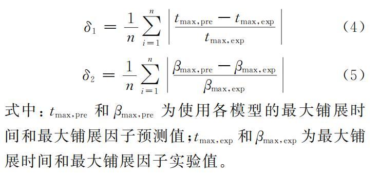 利用表1中的模型,對乙醇液滴沖擊過冷水平壁面的最大鋪展時間和最大鋪展因子進(jìn)行預(yù)測,并采用相對平均偏差δ為評價指標(biāo),衡量不同公式的預(yù)測效果