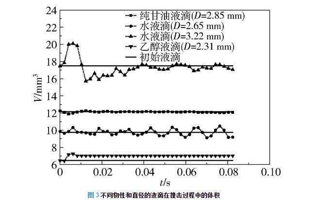 圖3不同物性和直徑的液滴在撞擊過(guò)程中的體積